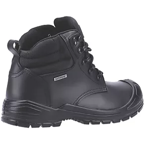 Fully waterproof practical safety boots with steel toe and midsole, double padded mesh collar, PU scuff cap for extra durability, moulded PU footbed for all-day comfort and dual-density PU outsole.