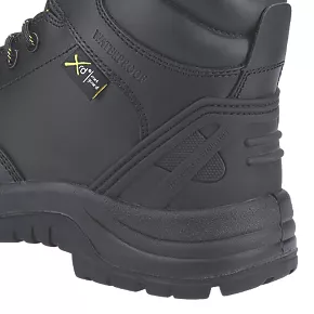 Metatarsal unisex safety boot with internal waterproof membrane. Crafted with water-resistant leather and composite toe. Twin padded PU collar and removable PU footbed.